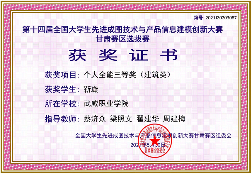 第十四屆全國大學生先進成圖技術與產品信息建模創(chuàng)新大賽甘肅賽區(qū)選拔賽獲個人全能三等獎(建筑類)
