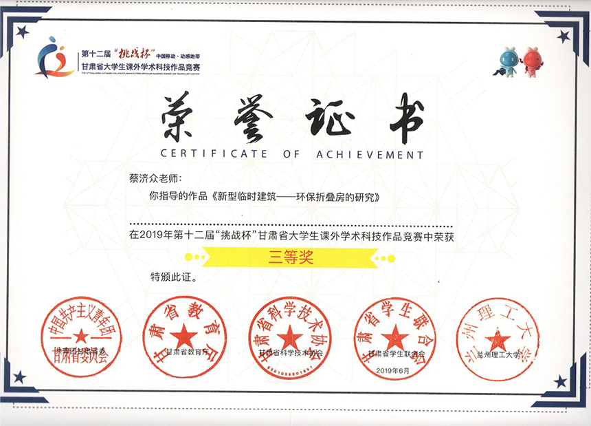 第十二屆“挑戰(zhàn)杯”甘肅省大學(xué)生課外學(xué)術(shù)科學(xué)作品《新型臨時建筑—環(huán)保折疊房的研究》